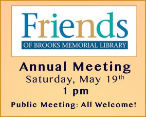 The public is invited to attend the Annual Meeting of the Friends of Brooks Memorial Library on Saturday, May 19, at 1:00pm. The meeting will be held in the meeting room on the top floor of the library next to the Children’s Room. The Friends of the Library are the main fundraisers for Brooks, and support many of our free, public events as well as our publicly accessible technology.