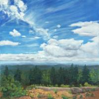 During March and April, Westminster West painter Nancy Calicchio is showing “Landscape Trilogy” in the foyer and other gallery spaces at All Souls Church in West Brattleboro. This exhibition features groups of three paintings of the same subject, each canvas a further interpretation of the landscape. In the larger (36”x36”) works, Nancy explores the balance between earth and sky. She invites the viewer to feel the long view of overlapping hills and the mysterious ambiguity of the far horizon as she searches to create the illusion of depth on a flat surface. Additional paintings round out her study of the earth-sky relationship.