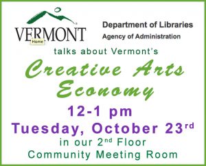 Join us on Tuesday, October 23, 2018, from 12 – 1 pm for a Vermont Department of Libraries presentation about the Creative Arts Economy! This presentation will highlight ways in which Vermonters make a living through the arts or other creative endeavors.
