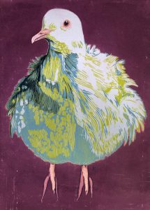 Castonguay’s woodblock prints invoke disparate influences including Japanese ukiyo-e, the naturalist works of Audubon and the expressionism of Baskin. He fills his paracosm with familiar animals made beholden with human emotions. Being a birder himself, most of his images are avian or strangely bird-like, bold personalities seemingly at odds with each subject’s intrinsic wildness. The artist’s distorted narratives often incorporate covert references to environmental decline, natural resource commodification, and displacement.