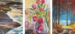 It was only in 2006 that she returned to her first love, that of drawing and painting. The work in this show includes watercolors and oils, a few in large-format sizes. Most are floral still-lifes, landscapes in a range of seasons, and recent seascapes expressed in the many tones that bring trees, rocks, sand, and water to life on paper and canvas. A selection of Sylvia’s hand-painted tee shirts, created using a variety of techniques, will also be displayed and offered for sale during the reception.