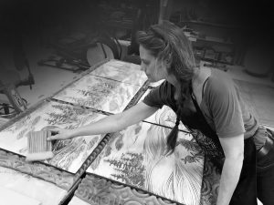 Image Caption/Credit: Cynthia Parker-Houghton, Brattleboro Words Trail’s map artist, at work at Natalie Blake Studios. Credit: Courtesy Cynthia Parker-Houghton