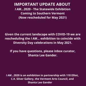 I AM…2020 is an exhibition in partnership with 118 Elliot, C.X. Silver Gallery, the Vermont Arts Council, and Shanta Lee Gander.