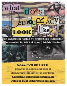Indivisible Brattleboro is a grassroots network of neighbors working to protect and strengthen our democracy through civic engagement, public events, and community action. We believe that art is essential for building solidarity, telling the truth, and inspiring action.