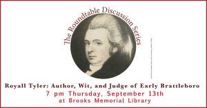 Join us on Thursday, September 13th, at 7 pm as Marius B. Péladeau, Don McLean, Christina Gibbons , and Tom Ragle come together for a moderated panel discussion about Royall and Mary Tyler. This Roundtable discussion series is part of the Peoples, Places and the History of Words in Brattleboro Project.