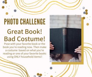 Join our Facebook group, then make a costume based on what you’re reading or a book you love using ONLY HOUSEHOLD ITEMS then share a picture with the book or let us guess. Let’s see what you come up with!