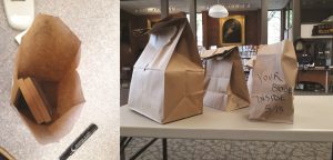 Please make sure to tell us what day (and time if possible) you plan to come, and make sure to bring a sign to display at the door. That way we can match the name on the bag with your name to avoid mistakes, while reducing direct contact ![]()