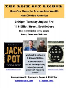 “The Rich Get Richer: How Our Quest to Accumulate Wealth has Divided America” will be the topic of a conversation between author/journalist Michael Mechanic and local author and campaigner Chuck Collins, at 7:00pm on Tuesday, August 3, at 118 Elliot (118 Elliot Street, Brattleboro). Since Mechanic and Collins share overlapping interests, their dialogue about the surprising advantages and pitfalls of wealth hoarding promises to be as lively as it is informative. The Rich Get Richer event is live, indoors, and limited to 50 people.
