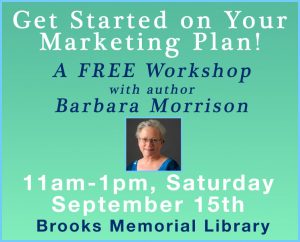 Join local author Barbara Morisson on Saturday, September 15th, from 11 am-1 pm for a FREE workshop, designed to help you learn how to strategize develop a marketing plan for your business! She will guide you through the questions necessary to solidify a basic plan, and discuss the pros and cons of the most effective marketing tools available today.