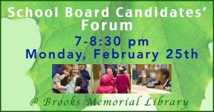 We are excited to host a Brattleboro Town School Board Candidates’ Forum on Monday, February 25th from 7-8:30 pm, downstairs in the Main reading Room!