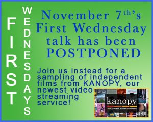 Due to unforseen circumstances, this First Wednesday lecture will not be presented this month. Instead, consider Joining us instead for a sampling of independent films from KANOPY, our newest video streaming service!