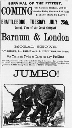 Jumbo was a world famous African elephant. He had spent almost his entire life in captivity, being captured as a calf after his mother was killed by hunters in 1861. He came by way of Paris and London zoos. Barnum bought and brought him to America in April of 1882, another tale in itself, just a few months prior to his Brattleboro visit.