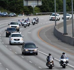The “car-valcade” was led by a phalanx of State Troopers on Harleys, followed by about a half dozen large cars.