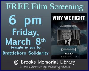 On Friday, March 8th at 6 pm, join us at Brooks Memorial Library, as Brattleboro Solidarity shows a FREE screening of the documentary “Why We Fight.” This film describes the rise and maintenance of the United States military–industrial complex and its 50-year involvement with the wars led by the United States to date, especially its 2003 Invasion of Iraq.