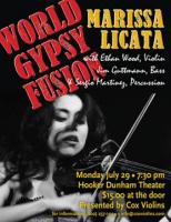 Honduran violinist Marissa Licata will perform with her World-Gypsy Fusion ensemble at the Hooker-Dunham Theater on Monday, July 29 at 7:30 pm. Tickets are $15 at the door – cash or checks only.
