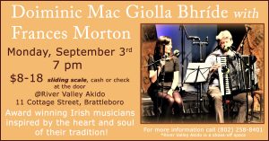 Join Doimnic Giolla Bhríde and Frances Morton on Monday, September 3rd, at River Valley Akido for an evening of music inspired by the greatest Irish traditions! Doiminic speaks both English and Irish, and hails from a Donegal Gaeltacht. His earliest local influences include Caitlín Ní Dhomhnaill, Lillis Ó Laoire, Áine Bn. Uí Laoi, Mairead Ní Mhaonaigh and his mother Nellie Nic Giolla Bhríde.