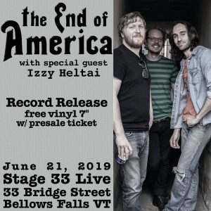 The End of America plays Friday, June 21. Izzy Heltai opens. Door at 7 PM, music at 8. Each advance ticket is bundled with a 7″ vinyl copy of the new single. There are only 40 chairs. Entry is $15, all proceeds go to the band. Prepaid tickets are available through www.stage33live.com/2019/06/the-end-of-america/