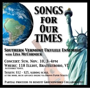 Directed by Lisa McCormick, the Southern Vermont Ukulele Ensemble (30+ members!) presents a concert of songs promoting Care of the Planet, Community-building, Welcome, Justice, and Peace.