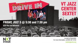 Next Stage Arts Project presents two Drive In theater concerts by the Vermont Jazz Center Sextet on Friday, July 3 at 5:30 and 7:30 pm in the Basketville parking lot in downtown Putney, VT. Cars will be socially distanced, leaving a vacant space between cars for lawn chair seating (bring your own chairs). Rain date for the concerts is Sunday, July 5.