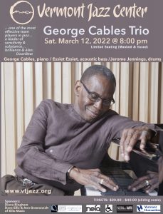 The Vermont Jazz Center will present the George Cables Trio in concert on March 12th at 8:00 PM. Cables will perform with his longstanding trio of Essiet Essiet on bass and Jerome Jennings on drums. The concert will be held in front of a full-capacity audience (proof of vaccination, photo ID, and masks required) and will also be live streamed on Facebook and the VJC’s website.