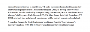 Brooks Memorial Library in Brattleboro, VT seeks experienced consultant to guide staff and trustees in preparation of a Request for Proposal (RFP) to develop a new website. Submissions must be received by 4:00 pm Friday, January 11, 2019 at Brattleboro Town Manager’s Office, Attn: BML Website RFQ, 230 Main Street, Suite 208, Brattleboro, VT 05301, at which time and place all submissions will be publicly opened and read aloud.