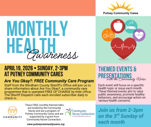 Join us from 2-3pm on the 3rd Sunday of April for this FREE event. This event will take place at Putney Community Cares, 54 Kimball Hill in Putney and there is no cost to participate.