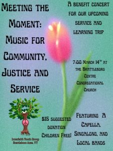 A benefit concert, Meeting the Moment: Music for Community, Justice & Service, will be held on Saturday March 14 at 7 pm at Centre Congregational Church to support the Brattleboro Area Interfaith Youth Group’s upcoming service and learning trip to Charleston, South Carolina.