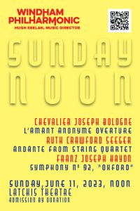 Enjoy a special noontime concert by the Windham Philharmonic at the Latchis Theater in Brattleboro.  The program will include works by Chevalier Joseph Bologne, Ruth Crawford Seeger, and Franz Joseph Haydn. Bologne, also known as “Black Mozart,” was a free man of Creole ancestry who was an esteemed violinist, fencer, and composer in France at the turn of the 19th century. Bologne has become better known as a result of the film “Chevalier,” a 2022 release. We will perform his overture to “L’Amant Anonyme.” Ruth Crawford Seeger was a mid-twentieth century American composer who had a fondness for classical style music as well as American folk music. She was also the stepmother of the legendary Pete Seeger. We will perform Andante, arranged for string orchestra from her String Quartet 1931. “Papa” Haydn composed 106 symphonies; we will perform number 92, the “Oxford.” This symphony debuted in Paris in 1789, but received its “title” after being presented to Oxford University as an example of Haydn’s compositional style when he received his Doctorate of Music.