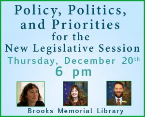 Join us on Thursday, December 2oth at at 6pm in the Community Roomfor the first in a series of monthly policy conversations. Representatives Emilie Kornheiser, Molly Burke, Tristan Toleno, and many of your neighbors will be coming together to talk about community goals for the coming year.