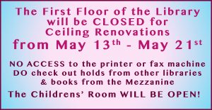 Sections of the library’s first floor and mezzanine will be curtained off and closed from May 13 through June 4 including two days (May 20 and 21) when the entire lower level will be inaccessible. We thank you for your patience as we install a new ceiling, more efficient lighting, and air vents that will minimize noise while making the most of our new HVAC system. The Children’s Room and Teen Room will be open throughout these phases of construction.