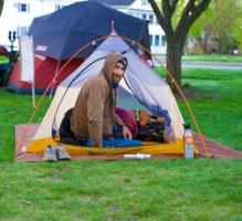 Photo: Chad Simmons emerges from his tent after a night of camping on the Brattleboro Common at last year’s Camp for a Common Cause. Photo credit: Jeff Woodward Photography.