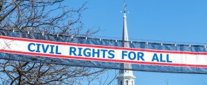 I believe deeply in “Civil Rights For All”. I cherish the promise of democracy. I have a dream of equal civil rights for all people. So, I go down to watch the banner go up, rain or shine. I just plain feel good when I see those words on a banner.