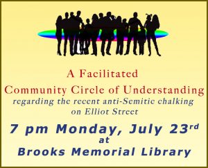 Join us at 7 pm on Monday, July 23rd for A Facilitated Community Circle of Understanding: regarding the recent anti-Semitic chalking on Elliot Street, as the Brattleboro Community Justice Center encourages discussion and sharing of concerns, hopes and ideas, around recent events. This FREE, accessible event is co-hosted by the Brattleboro Compassionate Community Committee.