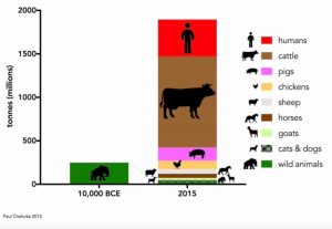 From this chart we see that in 10,000 BCE (12,000 years ago) wild animals comprised 100% of the total vertebrate biomass on this planet. Today, wild animals comprise only 4% — less biomass than the cats and dogs that we humans keep for pets. The world’s cattle now comprise a greater biomass than all other animal species combined. Now you can believe that methane from cattle can make a deadly difference.