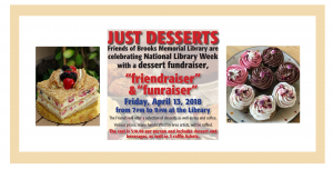 The Friends of Brooks Memorial Library will celebrate National Library Week (April 8 to April 14) with a dessert fundraiser and “Friendraiser” on Friday, April 13, 2018 from 7pm to 9pm at the Brooks Memorial Library.