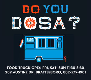 Dosa Kitchen food truck has been offering the Authentic Dosa Experience since 2014. Fans travel from Boston and beyond to Brattleboro for what they call “the best dosas in the USA.” The dosa, South India’s version of the crepe, has a seductively sour, tangy flavor, and airy, crisp texture. It’s gluten-free, vegan, and one of HuffPost’s “10 Foods to Try Before You Die.” Dosa Kitchen’s original Dosa Batter, a premade, ready-to-pour sourdough-style batter is produced on the premises and is available at the factory store behind the food truck and stores throughout New England. We hope to see you this season!