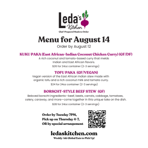 At Leda’s Kitchen, I draw on my adventures as a private chef, cookbook author, and co-owner of Dosa Kitchen Food Truck to offer weekly-ish gluten-free heat-and-eat meals designed to awaken your senses and fit seamlessly into your schedule. My menus feature curries, stews, nourishing soups and stews inspired by diverse food traditions. I cook with high-quality ingredients including free-range meats and focus on local and organic sourcing. You decide when to eat, as all dishes are designed to reheat beautifully, maintaining or even increasing their original deliciousness.