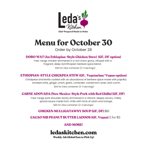 It’s fall, which means it’s Mulligatawny Soup season! This dish is among my most requested. Additionally, I’m excited to feature two Ethiopian meals on the menu—dishes I haven’t prepared in quite some time—along with carne adovada to make tacos with to complete this diverse selection. Orders due Tuesday, October 28 at 7PM for pickup Thursday, October 30. Questions? Message me at ledaskitchen@gmail.com or 802-246-7592.