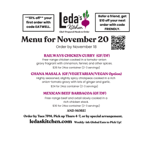 Questions? ledaskitchen@gmail.com or 802-246-7592. Subscribe to my mailing list for most recent menu drops (they don’t all appear here) and get 10% off your first order with the code ibrat.