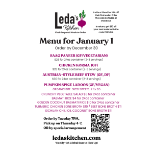 About: At Leda’s Kitchen, I draw on my adventures as a private chef, cookbook author, and co-owner of Dosa Kitchen Food Truck to offer weekly-ish heat-and-eat meals designed to awaken your senses and fit seamlessly into your schedule. My menus feature curries, stews, nourishing soups and stews inspired by diverse food traditions. I cook with high-quality ingredients including free-range meats and focus on local and organic sourcing. You decide when to eat, as all dishes are designed to reheat beautifully, maintaining or even increasing their original deliciousness.