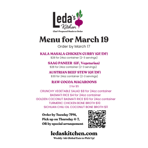 About: At Leda’s Kitchen, I draw on my adventures as a private chef, cookbook author, and co-owner of Dosa Kitchen Food Truck to offer weekly-ish gluten-free heat-and-eat meals designed to awaken your senses and fit seamlessly into your schedule. My menus feature curries, stews, nourishing soups and stews inspired by diverse food traditions. I cook with high-quality ingredients including free-range meats and focus on local and organic sourcing. You decide when to eat, as all dishes are designed to reheat beautifully, maintaining or even increasing their original deliciousness.