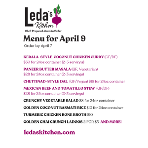 About: At Leda’s Kitchen, I draw on my adventures as a private chef, cookbook author, and co-owner of Dosa Kitchen Food Truck to offer weekly-ish mostly gluten-free heat-and-eat meals designed to awaken your senses and fit seamlessly into your schedule. My menus feature curries, stews, nourishing soups and stews inspired by diverse food traditions. I cook with high-quality ingredients including free-range meats and focus on local and organic sourcing. You decide when to eat, as all dishes are designed to reheat beautifully, maintaining or even increasing their original deliciousness.