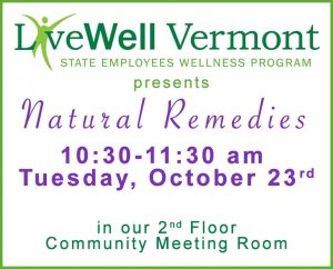 Join us on Tuesday, October 23, 2018, from 10:30-11:30 am for aLiveWell Vermont presentation about natural remedies. This is the first in a series of events here at Brooks Memorial Library for the Governor Scott’s “Capitol for a Day” initiative.