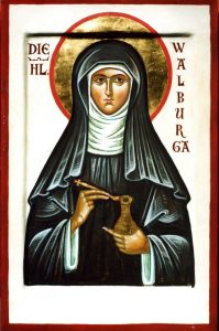 Saint Walpurga is revered by Christians for battling rabies and whooping cough. Miracle cures are reported from ailing people who anoint themselves with a fluid known as Walpurga’s oil that drains from a rock at her shrine in Eichstatt, Germany.