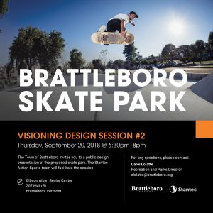 The Second Skatepark Design Meeting is scheduled for Sept 20th @ 6:30 pm at the Gibson Aiken Senior Center, Main Street in Brattleboro. You are welcome to attend this Visioning Design session with Stantec.