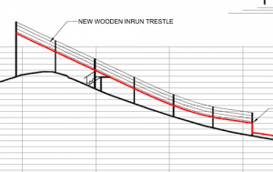 Brian Bannon sent along the following PDF drawing of the proposed plans for the ski jump at Living Memorial Park. It features a new wooden inrun trestle (the jump) and an altered hill profile (landing).