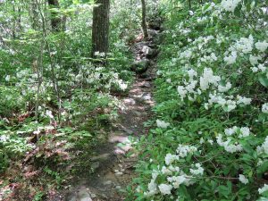 On Wantastiquet, the trail is dry and the mountain laurel is blooming. On June 23, 2021, there was no water on the carriage road trail up to the summit. Not even a puddle. Really, things are that dry. You can wear sneakers. And the mountain laurel will be in bloom for another week. Invasive mountain laurel is everywhere on Wantastiquet, unfortunately, but it sure is pretty for these two weeks. It doesn’t bloom well at lower elevations, so you won’t see blossoms until the 7th hairpin turn (out of 9). The blossoms are much better if you continue past the summit towards Mine Ledge. (The trail after the antenna tower is narrow. I found a tick on my arm within three minutes. Past the summit, tick precautions are necessary.)