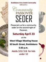 Please join Brattleboro Area Jewish Community for a community seder on the second night of Passover, Saturday April 23, 2016 at the West Village Meeting House at 5:30 p.m. Main dishes will be catered by Sharon Myers, and Cantor Kate Judd will be leading us through a traditional Jewish seder. You don’t have to be Jewish to share this journey and feast with us – all families and individuals are welcome!