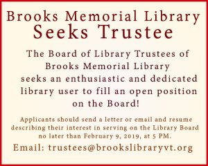 The Board of Library Trustees of Brooks Memorial Library seeks an enthusiastic and dedicated library user to fill an open position on the Board.