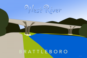We have a new poster in the Brattleboro Shop – a stylized view of the West River and I-91 bridge. It’s the latest addition to our original art series of Brattleboro travel posters and postcards, and the Brattleboro Shop is the only place you’ll find them.